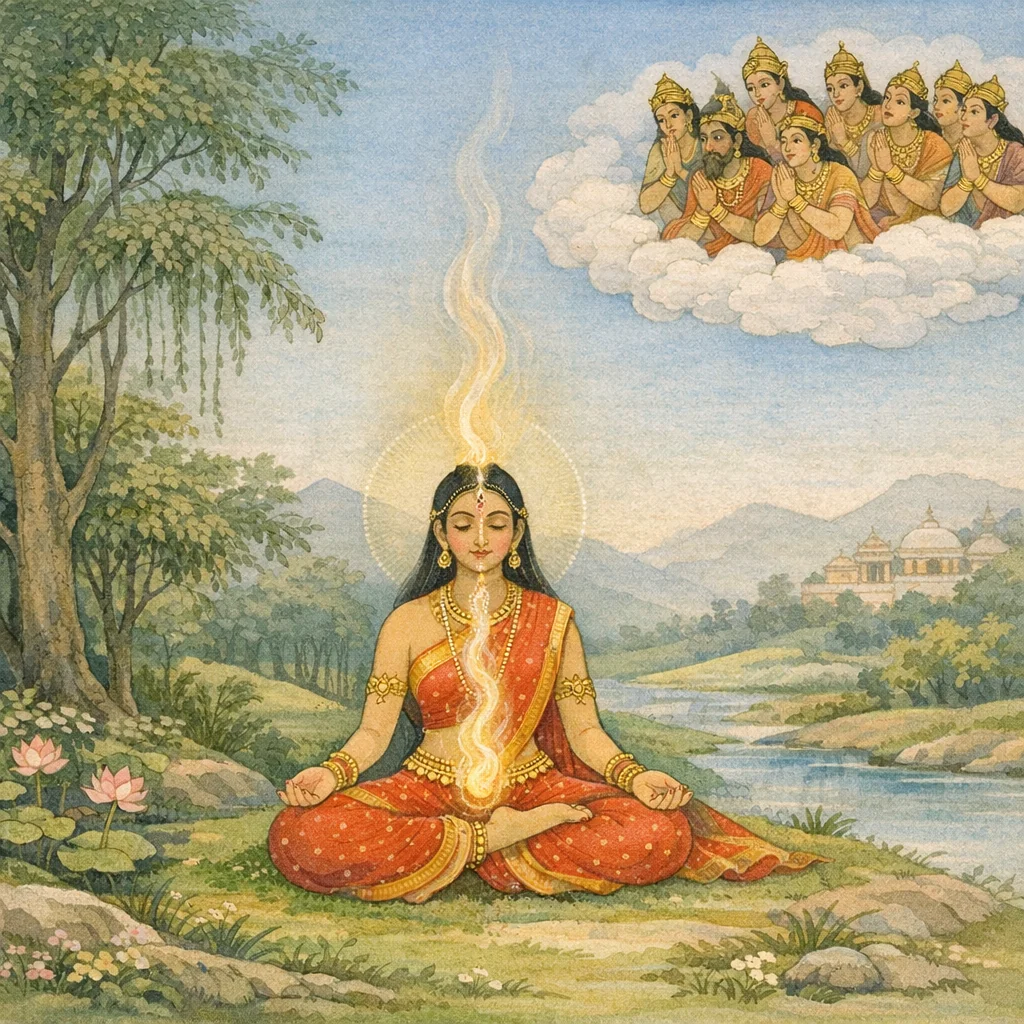 สตีได้จิบน้ำชำระตามพิธีอย่างถูกต้อง แล้วดำรงตนให้บริสุทธิ์และคลุมกายด้วยผ้าอย่างสำรวม นางหลับตา ระลึกถึงพระศิวะผู้เป็นสวามี แล้วเข้าสู่หนทางแห่งโยคะ।