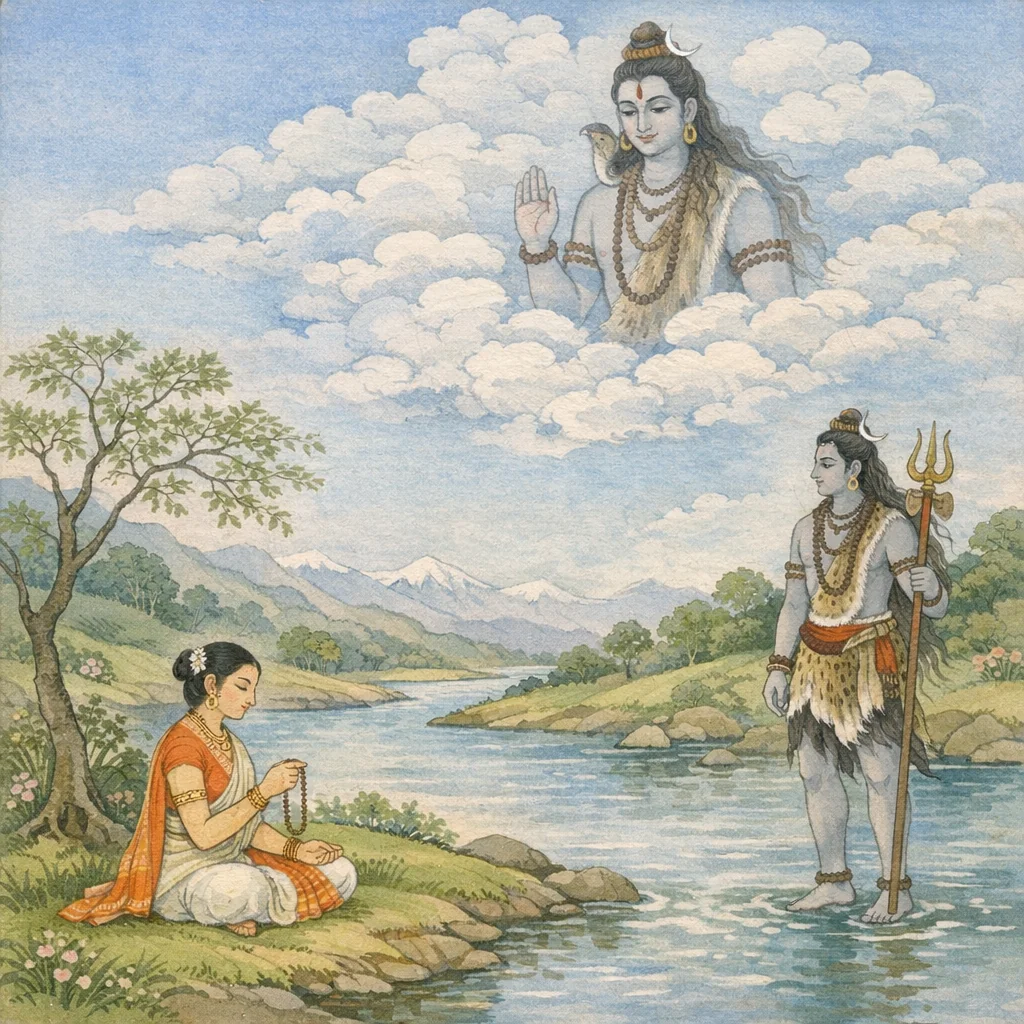 Sandhyā undertakes prolonged mantra-guided tapas (per Vasiṣṭha’s instruction) at the Bṛhallohita riverbank, after which Śiva (Śaṅkara/Śambhu) is pleased and manifests directly before her.