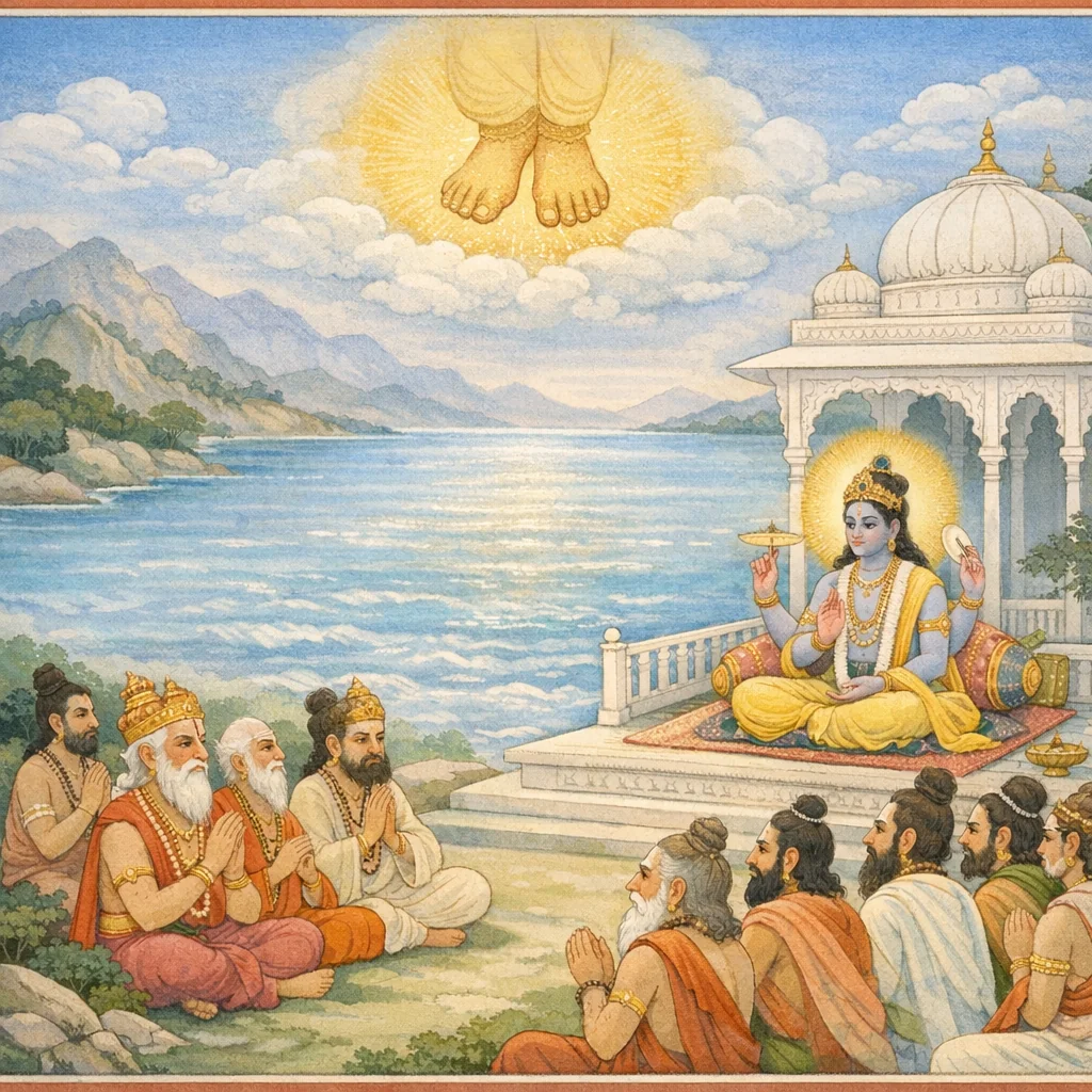 พระวิษณุตรัสว่า “โอ้พระพรหมและเหล่าเทพพร้อมทั้งฤๅษีเทพทั้งหลาย ท่านทั้งปวงมาด้วยเหตุอันใด? จงกล่าวทุกสิ่งด้วยไมตรีเถิด บัดนี้มีภารกิจใดต้องกระทำ?”