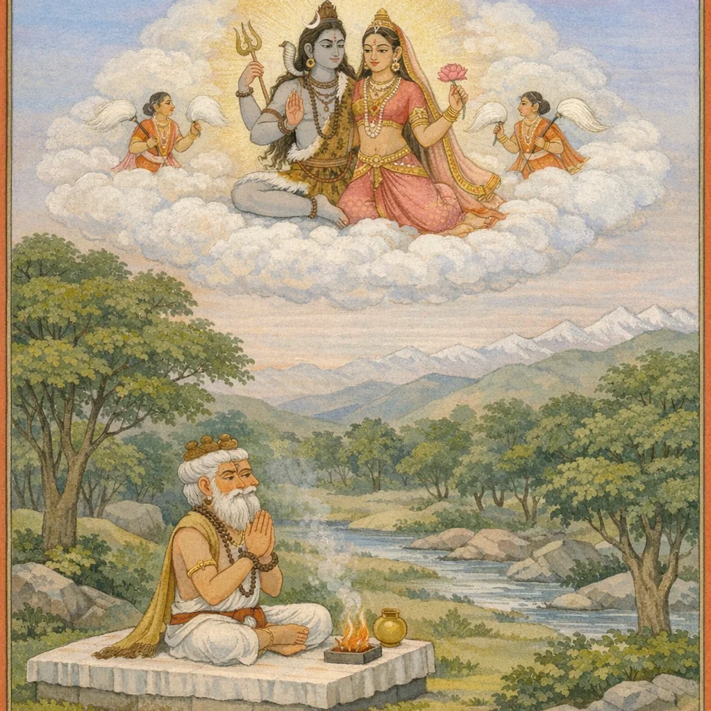 ด้วยตบะอันเข้มข้นของผู้ประเสริฐผู้มั่นคงในโยคะ ไม่นานนักบิดาของท่านก็ทรงพอพระทัย