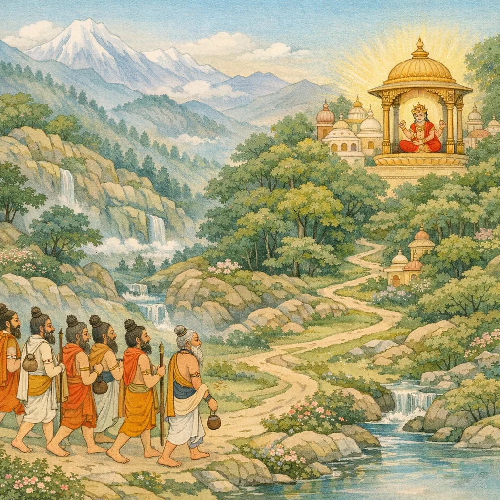 พวกท่านไปถึงยอดเขาพระสุเมรุอันเป็นมงคลและรื่นรมย์ ซึ่งคลาคล่ำด้วยเหล่าเทวะและทานวะ ที่ซึ่งเหล่าสิทธะและจารณะสนทนากัน และมีพวกยักษะกับคันธรรพคอยปรนนิบัติ