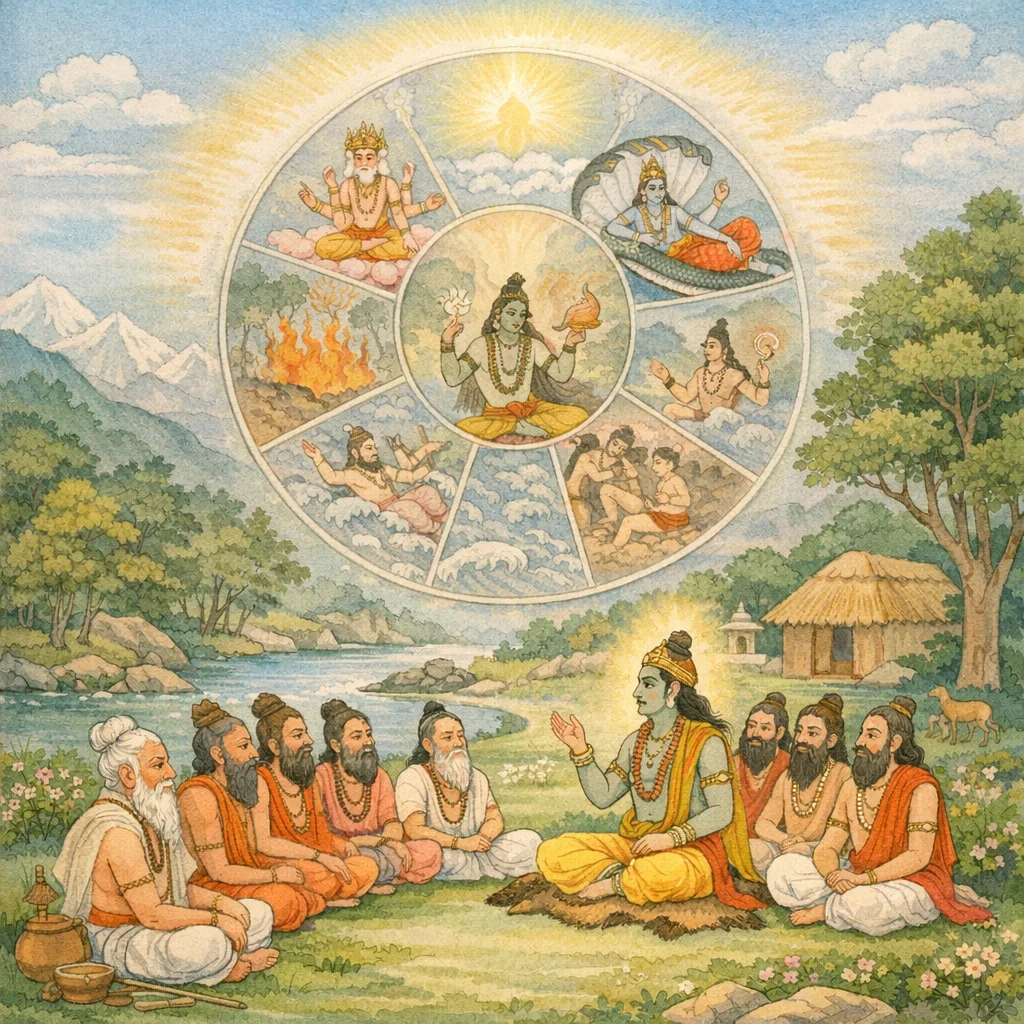 Rather than a single narrative event, the chapter presents a doctrinal dialogue: the sages interrogate the nature and authority of Kāla, and Vāyu answers with a theological definition culminating in Śiva’s supremacy over Time.