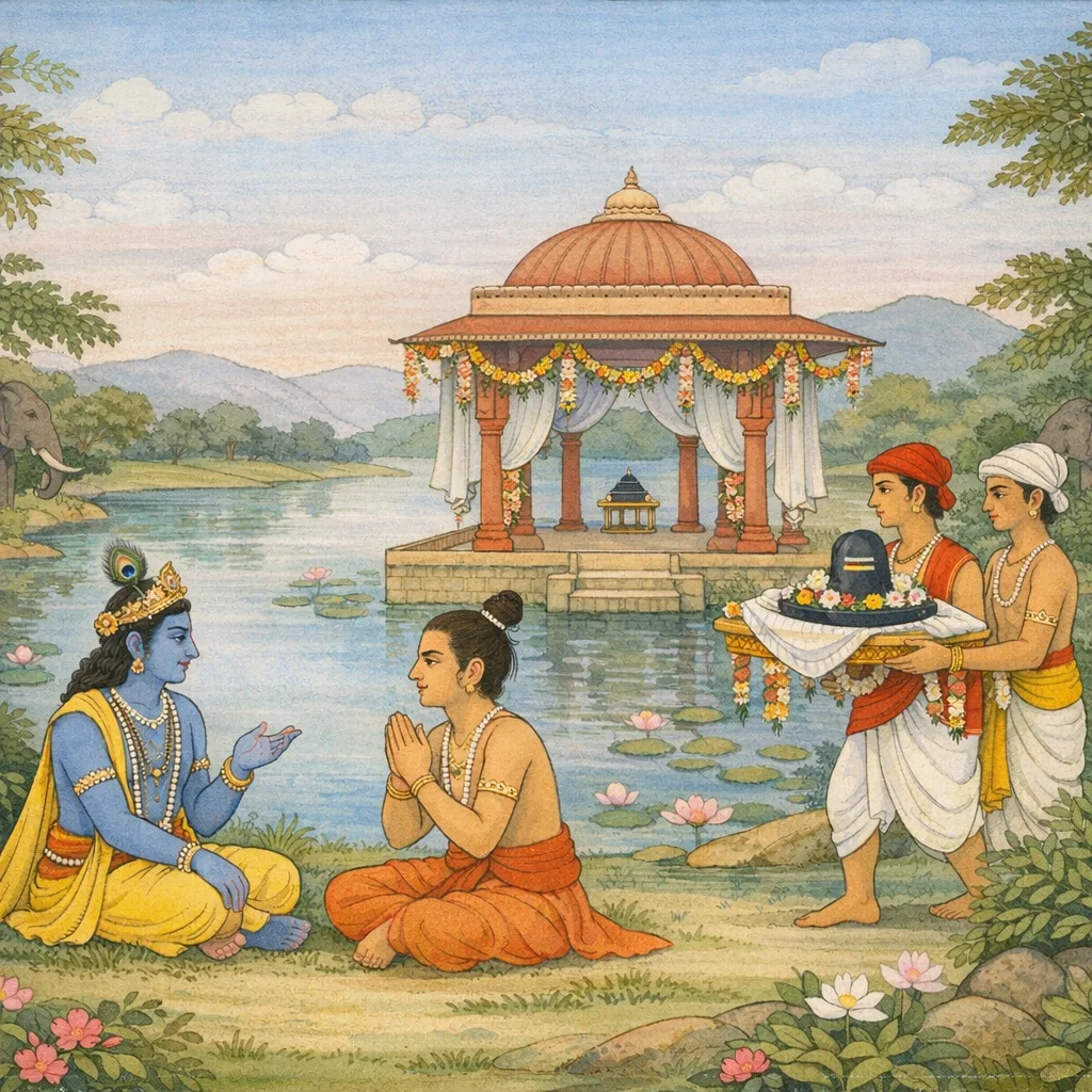ศรีกฤษณะตรัสว่า “ข้าแต่ภควัน ข้าพเจ้าปรารถนาจะสดับพิธีประดิษฐานอันประเสริฐยิ่ง ว่าพระศิวะทรงบัญญัติไว้สำหรับทั้งศิวลึงค์และเบระ (รูปเคารพ) อย่างไร”