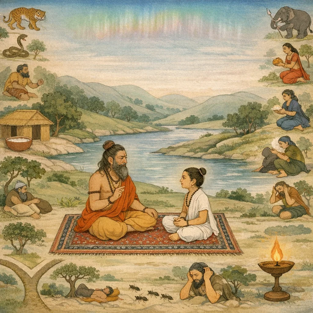 The sampled portion is primarily didactic rather than event-driven: Upamanyu instructs on yogic psychology—cataloguing antarāyas and upasargas—rather than narrating a discrete mythic episode.