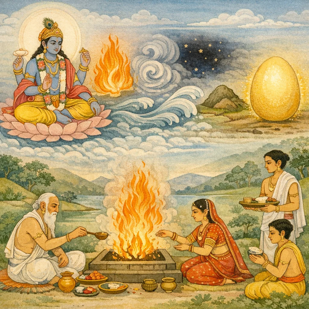 Environmental balance is implied through the cosmogonic sequence: earth (pṛthivī) arises through the consolidation and hardening of the elements, and the narrative positions yajña—mediated by Agni—as a stabilizing institution that organizes human consumption, offering, and redistribution. This can be read as an early model linking terrestrial formation, resource transformation (heat/fire), and regulated exchange.