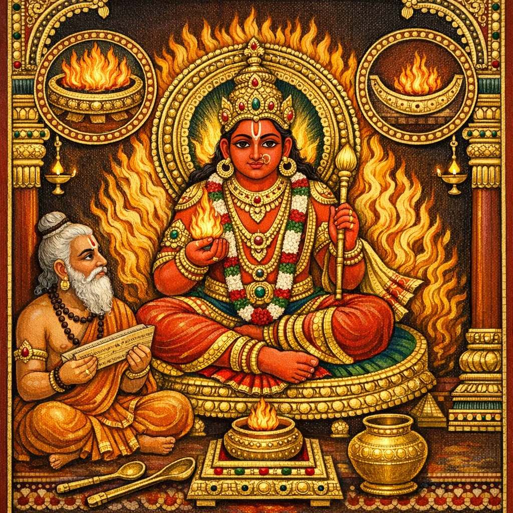 Matapos gawing ganap ang (paghahanda/altar) at hubugin ito bilang ritwal na may malinaw na kaayusan, sindihan o ilagay ang apoy habang inaalala si Hari (Viṣṇu). Pagkaraang maghandog ng mga patpat na panggatong (samidh) na humigit-kumulang isang dangkal ang haba, saka maingat na tipunin at ayusin iyon sa palibot.