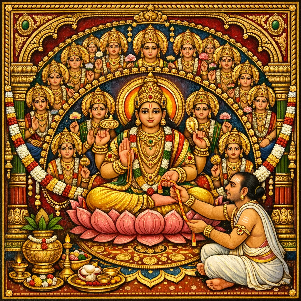 Si Puṣṭi (kasaganaan), si Tuṣṭi (kasiya-siya), at ang pangkat na nagsisimula kay Mahendra ay ilagay/anyayahan sa gitna; si Hari ay itatag doon sa bisa ng wika/mantra. Gayundin, si Dhṛti (katatagan), Śrī, Rati, Kānti at ang iba pa ay itatag sa ugat; at sa gayon si Acyuta ay naitatatag sa pamamagitan ng mūla-mantra (ugat na mantra).