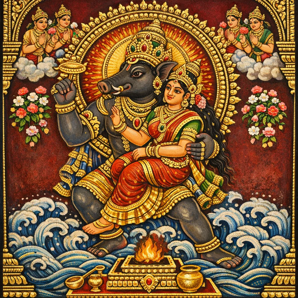 Nilapitan at pinuri ng mga diyos, si Viṣṇu ay naging Varāha (Baboy-Ramo), na ang mismong anyo ay ang Yajña (handog na sakripisyo). Matapos patayin ang Dānava na iyon, winasak din niya ang “tinik”—ang mapanlang na hadlang—kasama ng mga Daitya.