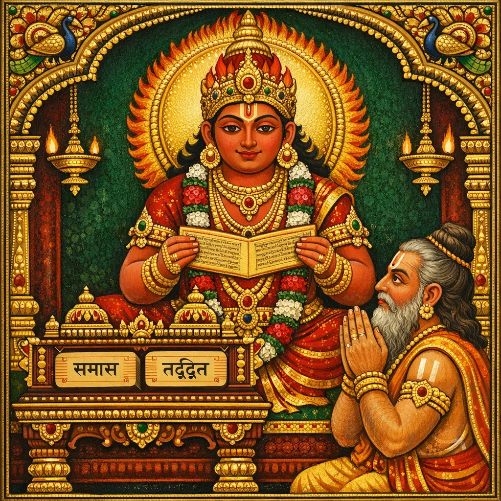 The chapter’s key technical function is structural: it formally concludes the Samāsa module and establishes the shift to Taddhita, reflecting a śāstric sequence in grammatical instruction.