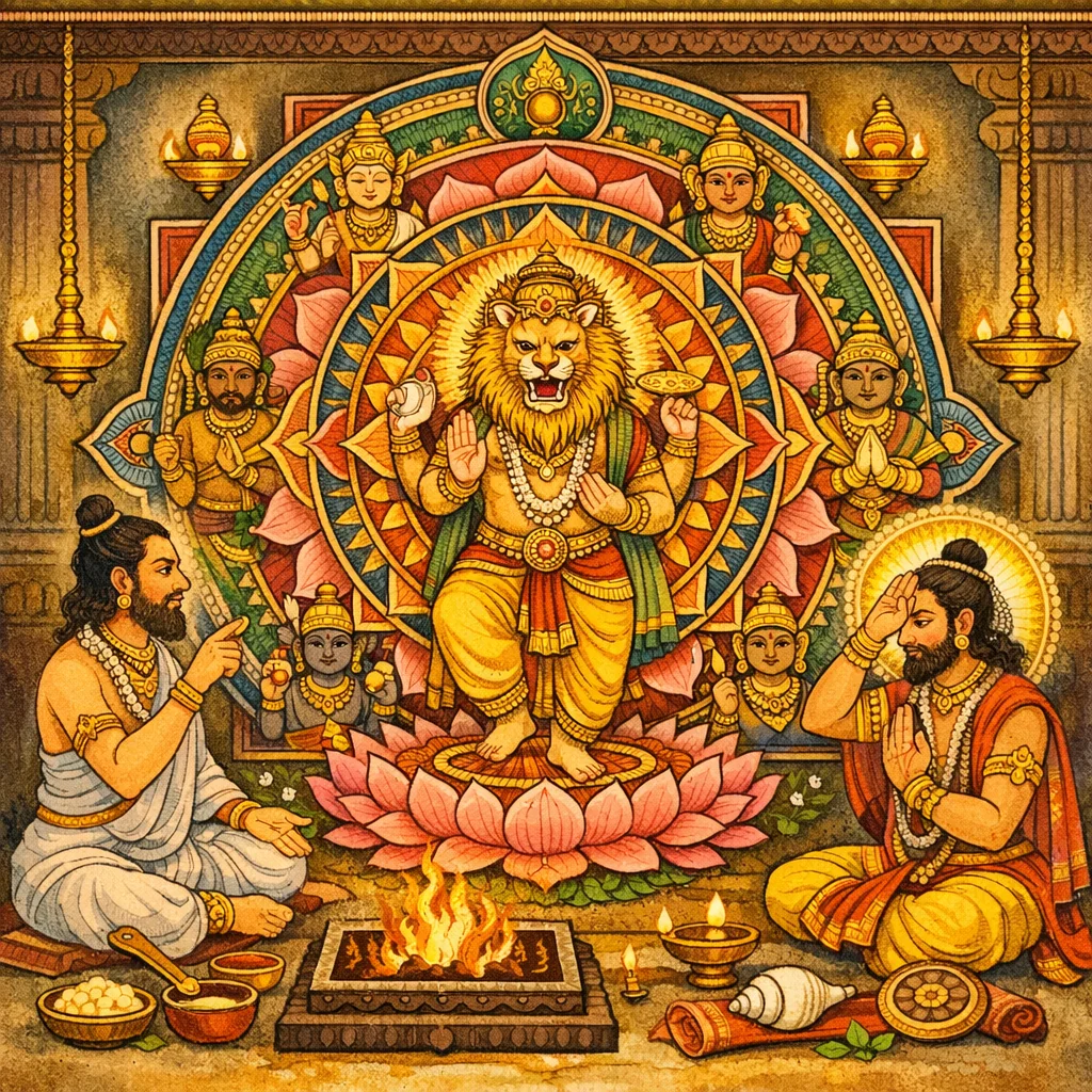 The chapter culminates in the Nṛsiṁha Gāyatrī (“We know the One with thunderbolt-like claws… may Narasiṁha impel us”), presented as a purifier and bestower of desired aims, integrating Purāṇic devotion with a recognizable Vedic metrical paradigm.