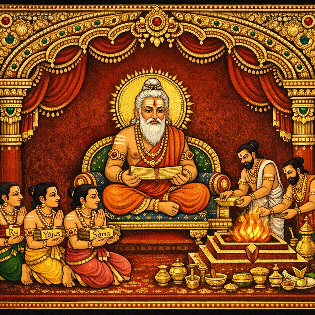 It explains the Dvāpara-yuga regime: how yajña and dharma are organized amid declining certainty, social-duty inversion, and the need to systematize Vedic transmission.