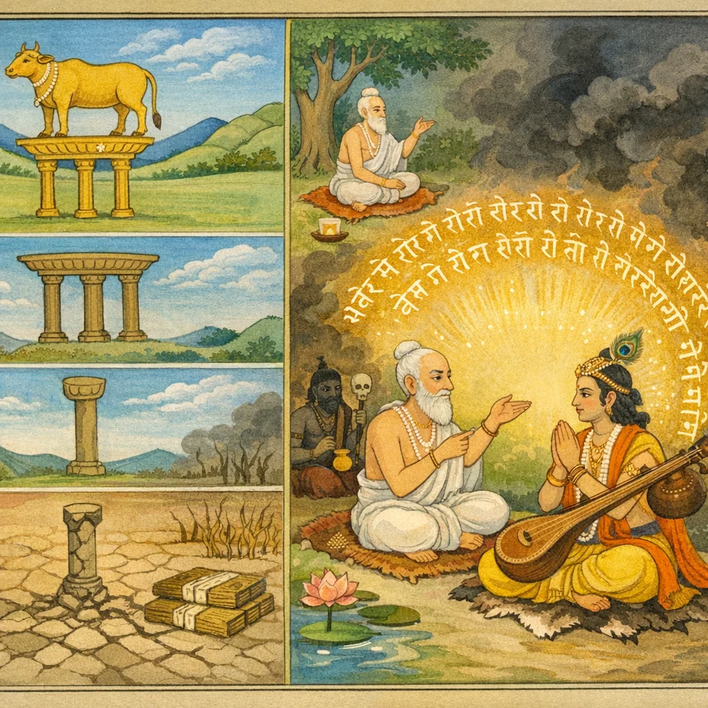میں کَلی یُگ کی حالت بیان کرتا ہوں—تم یکسو دل سے سنو۔ کَلی کے آنے پر دھرم صرف ایک پاؤں (چوتھائی قوت) پر قائم رہتا ہے۔