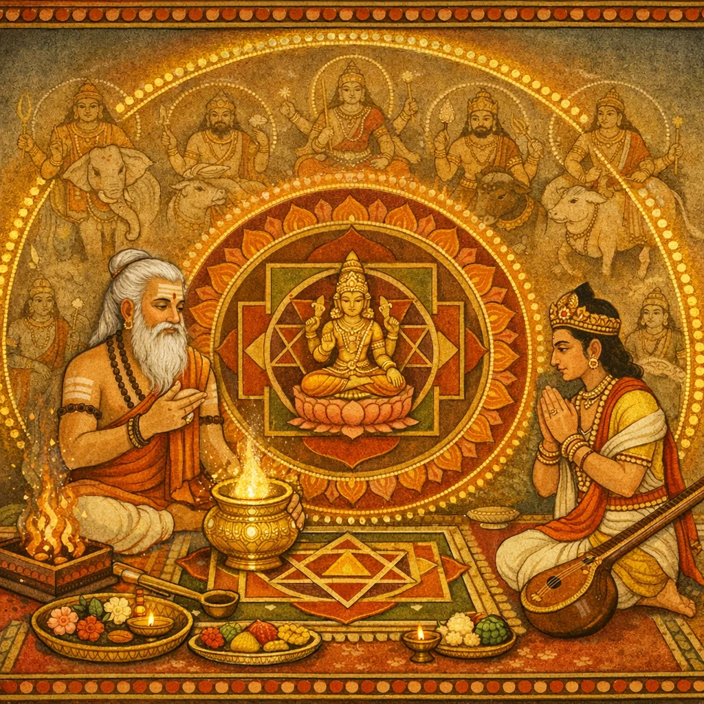 سنتکمار نے کہا—اب میں دیو-پوجا بیان کرتا ہوں جو سادھک کو مطلوبہ سِدھی عطا کرتی ہے۔ بائیں جانب مثلث یا مربع (منڈل/جگہ) قائم کر کے…