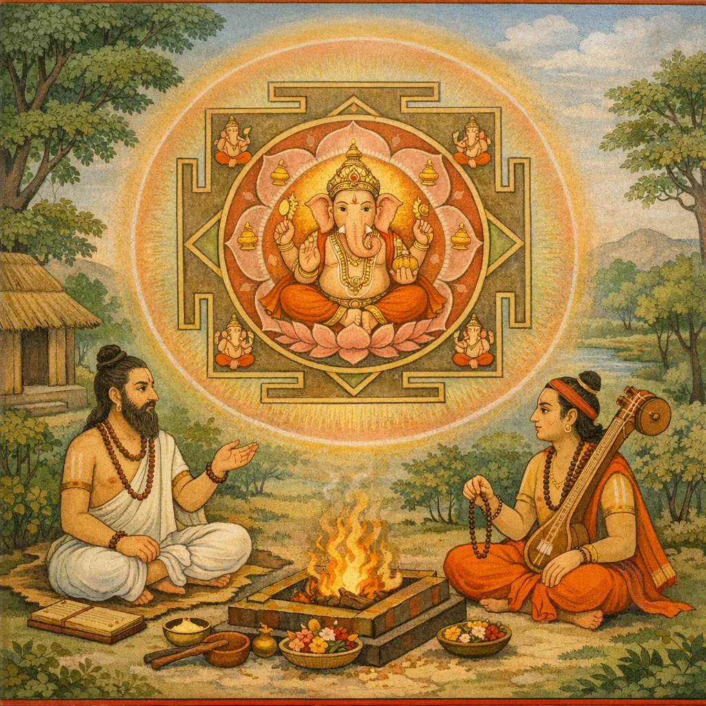 شری سنَتکُمار نے کہا: اب میں گنیش کے اُن منتروں کا بیان کرتا ہوں جو ہر مطلوبہ مراد دینے والے ہیں؛ اے برہمنوں کے سردار، جن کی سچی آرادھنا سے سالک بھکتی اور مکتی دونوں پاتا ہے۔