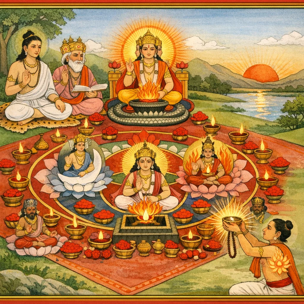 سنتکمار برہما کو سورج مرکز ‘تری روپ’ سادھنا (شیشودِتیہ/روی ودیا) کی تعلیم دیتے ہیں، جو آگے چل کر سوما اور گرہوں کی پوجا تک پھیلتی ہے۔ اس باب میں منتروں کے رِشی-چھند-دیوتا کی تعیین (دیوبھاگ/گایتری/روی؛ بھِرگو/پنکتی/سوما؛ وِروپاکش/گایتری/کُج)، شڈنگ نیاس، سوما-سورج-اگنی منڈل نیاس، ویاپک جپ، ہردے کمل میں روی دھیان اور بڑے جپ کے ساتھ دشامش ہوم بیان ہے۔ پیٹھ پوجا، آورن دیوتا و شکتیوں، دِشاؤں و ودِشاؤں کی स्थापना اور سادہ مگر پُراثر روزانہ اَرگھْیہ ودھی بھی مذکور ہے۔ بعد میں ماہانہ سوما اَرگھْیہ اور اولاد و قرض سے نجات کے لیے مکمل بھوما ورت (منگل وار)—سرخ سامان، 21 بار ترتیب، ستوتی، پردکشنا، آخر میں دان و دکشِنا—تفصیل سے آتا ہے۔ اختتام پر بدھ، گرو اور شکر کے منتر-پوجن کے خاکے اور ترسیل کے لیے رازداری و اہلیت کے اصول بتائے گئے ہیں۔