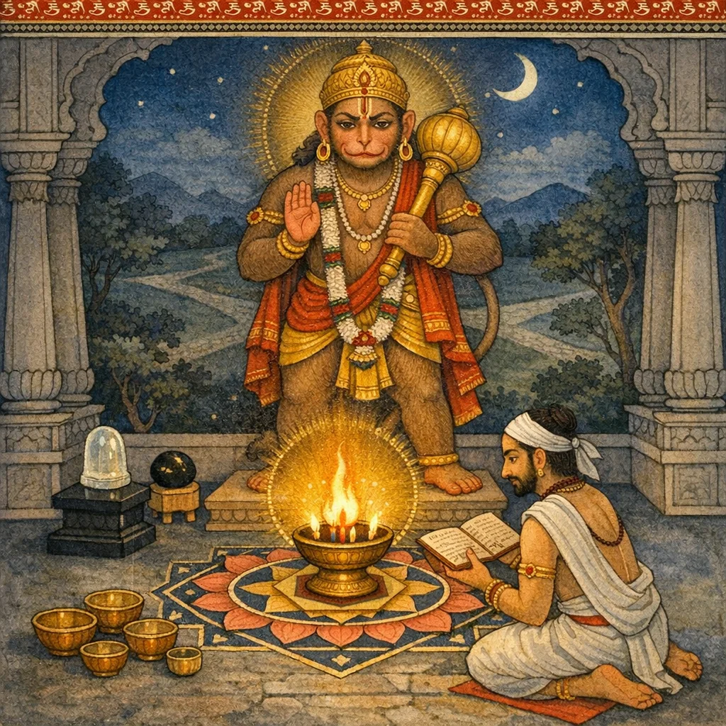 A codified Hanumān dīpa-dāna and nitya-dīpa procedure, including materials, measurements, places, maṇḍala design, and mantra-application, aimed at both welfare (prosperity, safety) and protective outcomes.