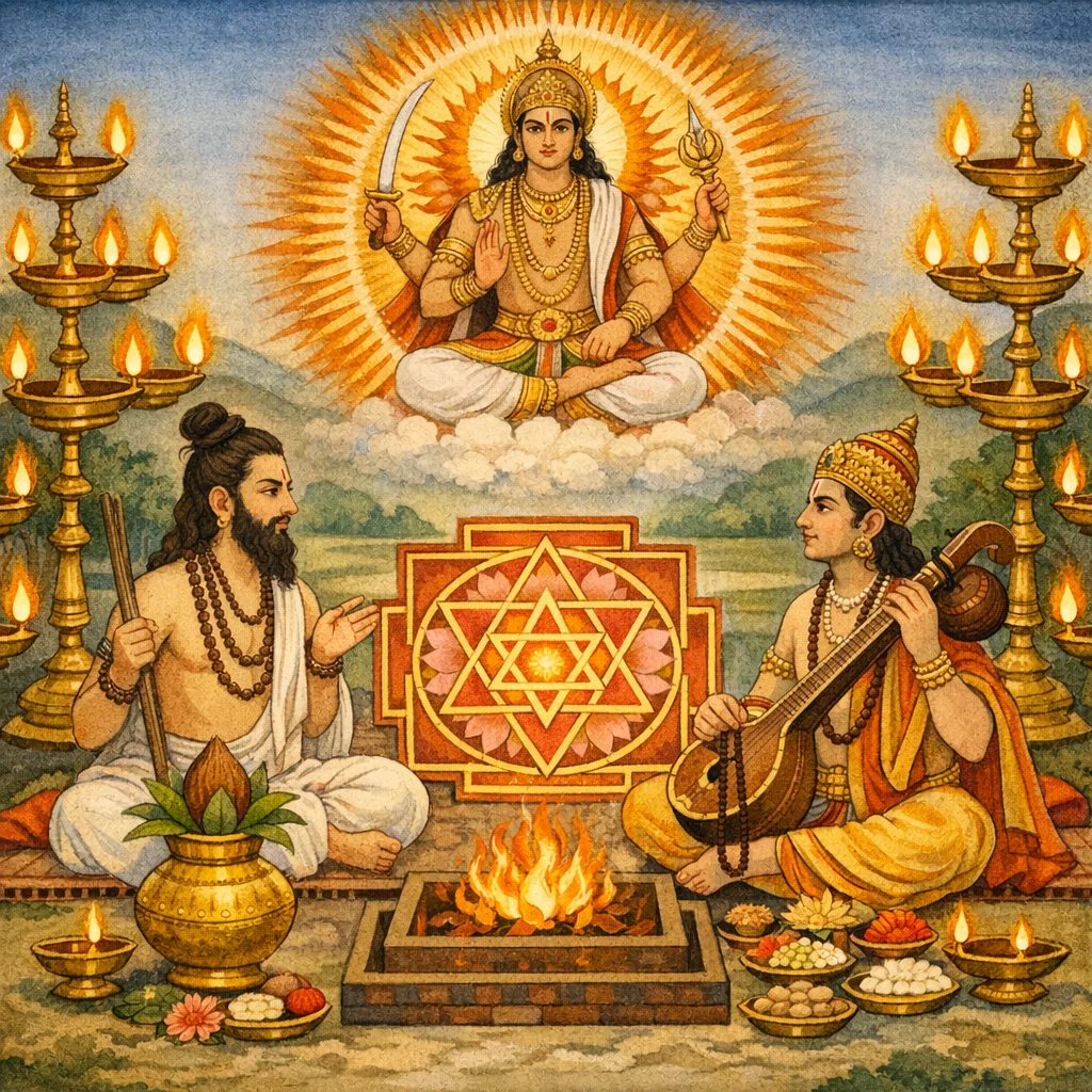 نارد کرم کے مطابق بادشاہوں کے عروج و زوال کو دیکھ کر پوچھتے ہیں کہ کارتویریہ ارجن کی دنیا میں خاص خدمت کیوں ہوتی ہے۔ سنت کمار بتاتے ہیں کہ وہ سدرشن چکر کے اوتار ہیں؛ دتاتریہ کی عبادت سے انہیں پرم تیج ملا، اور ان کا محض سمرن فتح اور نقصان کی تلافی دیتا ہے۔ پھر پہلے پوشیدہ تنترک طریقے بیان ہوتے ہیں—نیاس و کَوَچ کی جگہیں، منتر کی جانچ، وِنیوگ (رِشی دتاتریہ، چھند انُشٹُپ، دیوتا کارتویریہ ارجن، بیج/شکتی دھرو)، اَنگ نیاس اور دھیان کی مورتی۔ اس کے بعد جپ کی تعداد، ہوم کے حصے و آہوتیاں، شٹکون‑ترکون یَنتر کی ریکھائیں، اشٹ شکتی پوجا، مکمل یَنتر کی بناوٹ، کمبھ ابھیشیک کے پھل اور گاؤں کی حفاظت میں اس کے استعمال کا ذکر ہے۔ نتیجے کے مطابق ہوم کے درویے—اُچّاٹن، وشّیہ، شانتی، استمبھَن، سمردھی، چوری نِوارن—اور آہوتی گنتی کے قواعد بھی آتے ہیں۔ منتر خاندانوں اور چھندوں کی فہرست، گایتری کے استعمال میں احتیاط اور رات کے پاٹھ پر تنبیہ بھی دی گئی ہے۔ آخر میں مفصل دیپ ورت—مبارک مہینے/تھتھی/نکشتر/یوگ، چراغ کے برتن کا پیمانہ، بتیوں کی تعداد، स्थापना، سنکلپ منتر، شگون، آچار کی پابندیاں، گرو کی اجازت، اور برہمنوں کو کھانا و دکشِنا دے کر تکمیل؛ پھر اختتامیہ۔