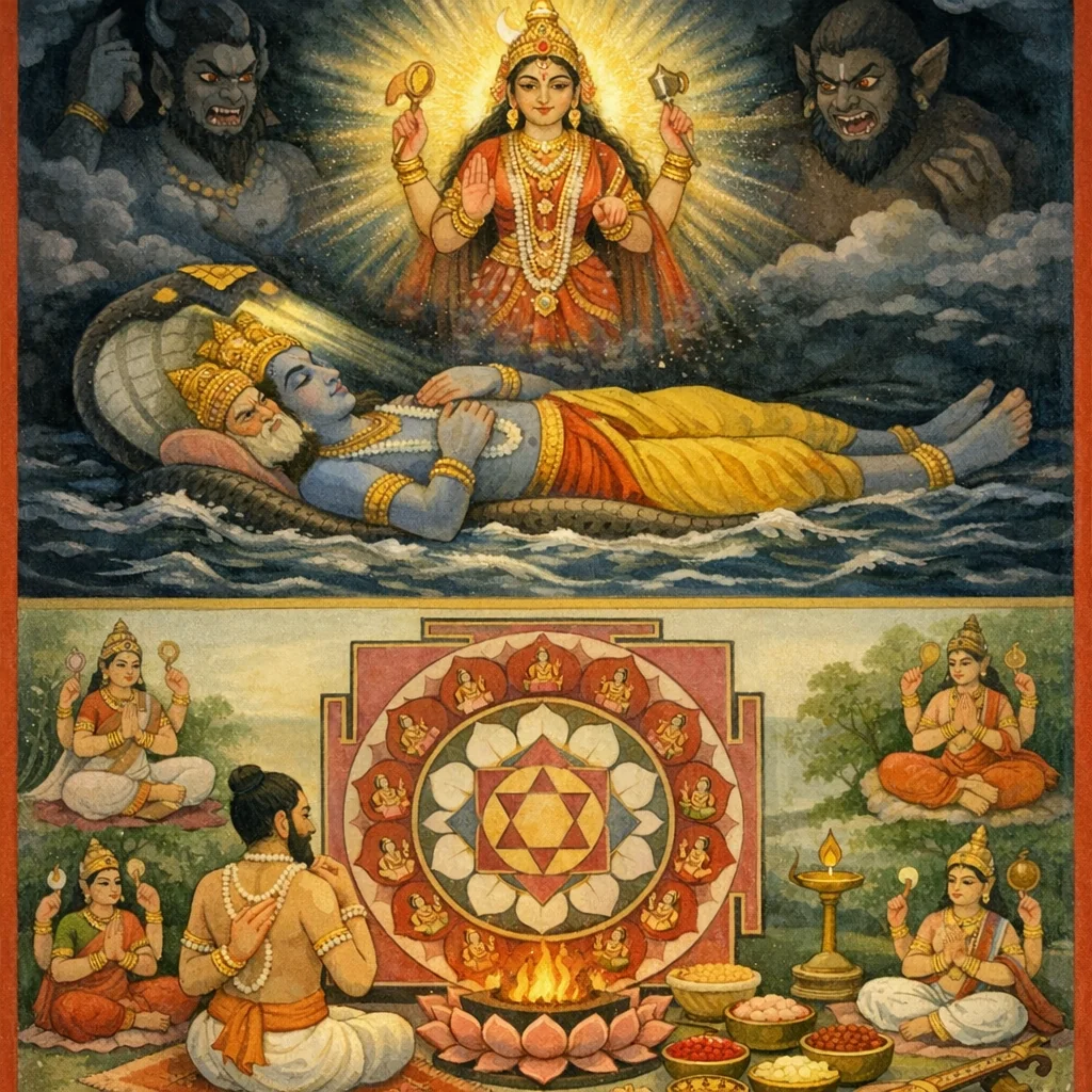 The Purāṇic method anchors technical ritual in an authoritative sacred narrative: the pralaya setting and Nidrā-Śakti motif establish the Goddess as cosmically operative (creation/obstruction) and thus a valid devatā for upāsanā. Myth functions as pramāṇa and sets the theological identity of the mantra’s presiding power.
