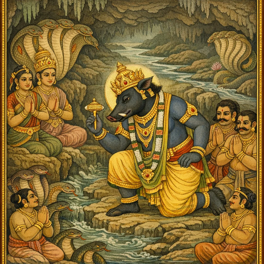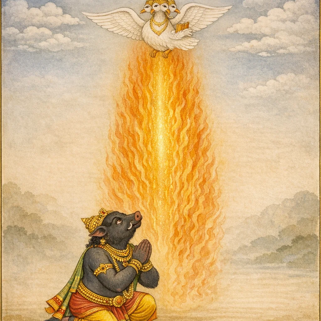 Tejastambha-anveṣaṇa: Viṣṇoḥ Varāhāvatāreṇa Mūlānveṣaṇam (Search for the Pillar of Light: Viṣṇu as the Boar Seeks the Base)