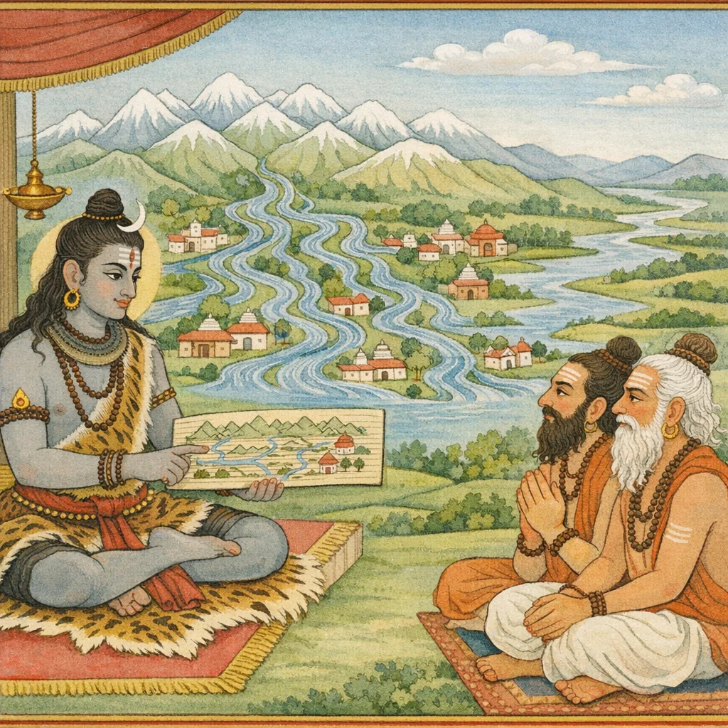 اس ادھیائے میں ورَاہ–پرتھوی کی تعلیمی فضا کے اندر، موصولہ سطور میں رُدر بطورِ متکلم بھدرآشو اور کیتُمال علاقوں کے نام لیتا ہے۔ پھر نِشَدھ کے مغربی حصے میں کُلاپَروَت (پہاڑی سلسلے) اور اُن سے وابستہ انسانی بستیوں/جنپدوں کا منظم بیان آتا ہے۔ بتایا گیا ہے کہ مقامی آبادیوں کی شناخت انہی مقاماتی ناموں سے سمجھی جائے، اور یہ جنپد اپنے قریب کے پہاڑوں سے نکلنے والی ندیوں کا پانی ‘پیتے’ ہیں، یعنی انہی پر انحصار رکھتے ہیں۔ آخر میں بڑی ندیوں کی فہرست دی جاتی ہے اور کہا جاتا ہے کہ بے شمار چھوٹی ندیاں بھی ہیں؛ یوں یہ باب پہاڑ، ریاستی علاقوں اور آبی نظام کو جوڑنے والا جغرافیائی اشاریہ ہے۔