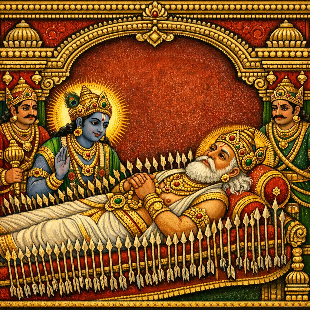 Được tán dương bằng thánh ca, ngài vẫn nằm trên giường tên, định phần hướng về cõi của các Vasu; và, hướng mắt về Uttarāyaṇa (đường đi lên phương bắc của mặt trời), ngài vững trú—quán niệm Viṣṇu và dâng lời ca tụng Ngài.