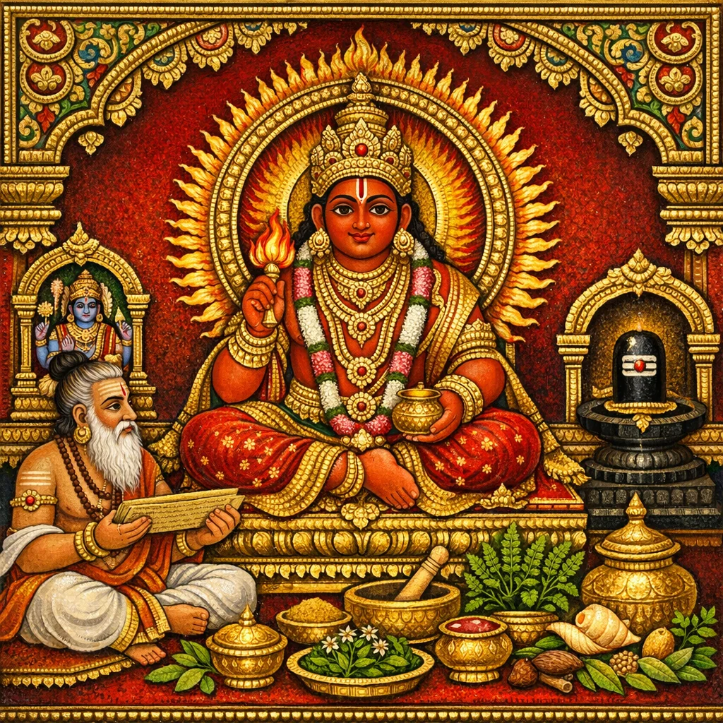 Chương này là phần kết chính thức (colophon) của mục y học trước đó mang tên Siddhauṣadhāni (“Những dược phương đã thành tựu/hoàn hảo”). Trong lối biên soạn Purāṇa, dấu kết này không chỉ là ghi chú biên tập mà còn xác nhận việc truyền thụ trọn vẹn một vidyā Ayurveda như một mô-đun độc lập trong hệ tri thức bách khoa Agneya. Việc nêu tên chương và niêm kết đặt y học như một śāstra có thể giảng dạy, gìn giữ và truyền tiếp với thẩm quyền. Ngay sau đó, văn bản chuẩn bị chuyển sang phần “Những thuốc trừ mọi bệnh”, cho thấy sự dịch chuyển từ các phương dược tinh luyện chuyên biệt sang các biện pháp phổ quát, phòng ngừa và điều hòa. Theo phương pháp samanvaya của Agni Purāṇa, y học được trình bày vừa thực tiễn vừa thiêng liêng: nâng đỡ sự ổn định thân thể để tâm được vững cho dharma và lòng sùng kính.