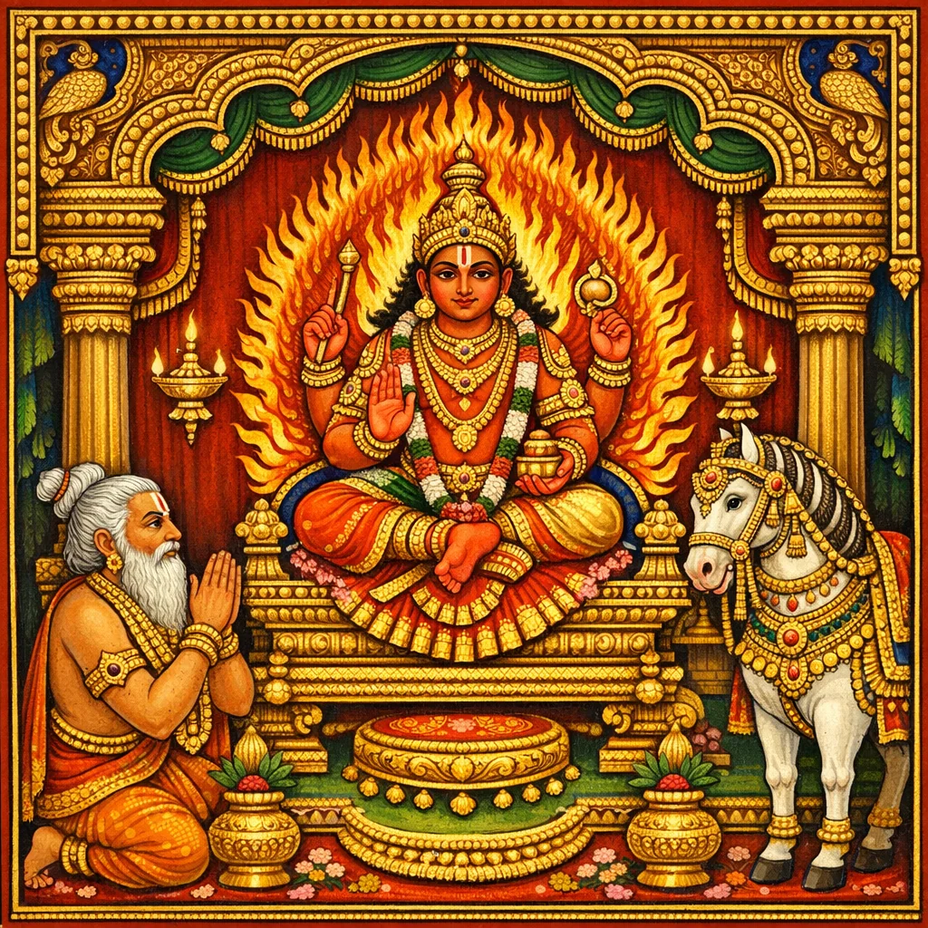 Vào ngày lành, sau khi cung kính thờ phụng Śrīdhara (Viṣṇu), Śrī (Lakṣmī) và Uccaiḥśravas—vua của loài ngựa—người ta nên làm lễ cúng lửa, rưới bơ ghee vào hỏa đàn trong khi tụng các thần chú Sāvitrī (Gāyatrī).