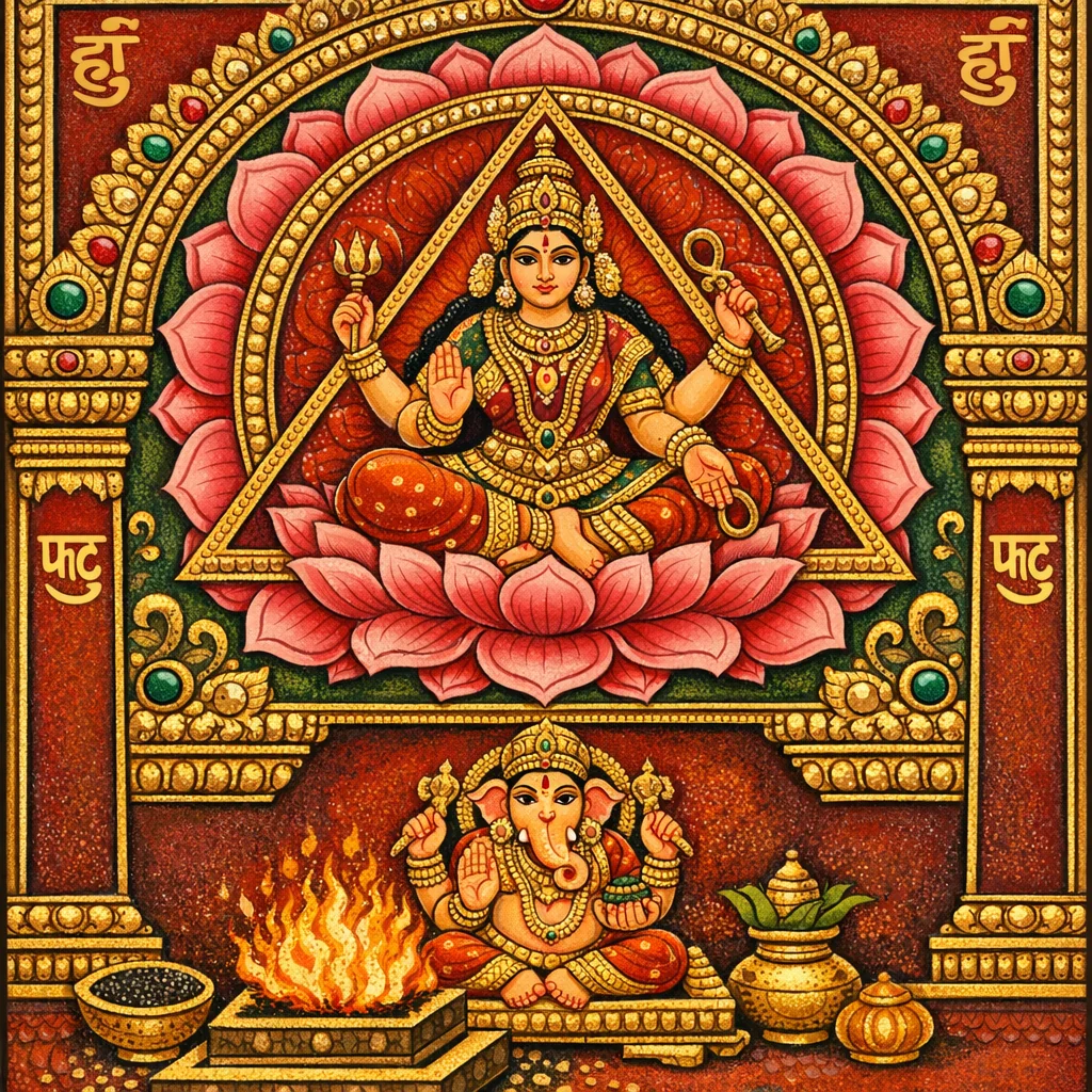 Rati (hoan lạc), Virati (ly dục), Prīti (thân ái), Viprīti (chán ghét), Mati (tri giải), Dhṛti (kiên định), Vidhṛti (kiên định nâng đỡ) và Puṣṭi (nuôi dưỡng) — các Śakti này phải được an lập theo thứ tự, kết hợp với Kāma và các năng lực liên hệ. (Rồi tụng:) “Oṃ chaṃ, Nityaklinne, Madadrave.” Tiếp theo tụng Mātrikā (bảng chữ cái): “oṃ oṃ: a ā i ī u ū ṛ ṝ ḷ ḹ e ai o au aṃ aḥ; ka kha ga gha ṅa … ha kṣa.” (Lại tụng:) “Oṃ chaṃ, Nityaklinne, Madadrave, svāhā.” Sau đó thực hiện nyāsa: an trí Ādhāra-Śakti, tòa sen (padma), tòa sư tử (siṃha), và an lập Nữ Thần tại tim cùng các vị trí khác trên thân.