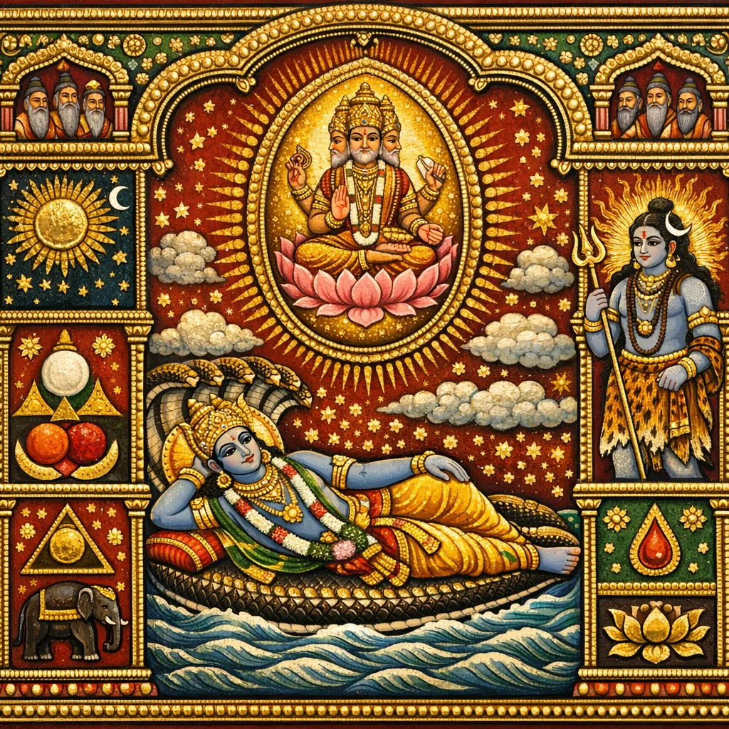 在最初之时,梵(Brahman)以未显(avyakta)而恒存;彼时尚无虚空(kha),亦无昼夜等相。随后毗湿奴(Viṣṇu)入于自性(Prakṛti)与灵我(Puruṣa)之中,使之震动,由此开启创生。