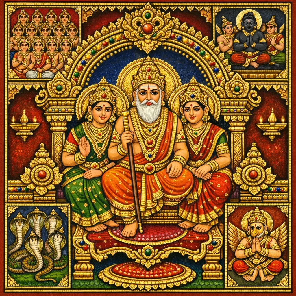 Ādityas from Aditi; Daityas from Diti (Hiraṇyakaśipu, Hiraṇyākṣa); Dānava branches via Prahlāda–Bali–Bāṇa; and nāga/bird lineages via Kadrū and Vinatā (Śeṣa, Vāsuki, Takṣaka; Aruṇa, Garuḍa).