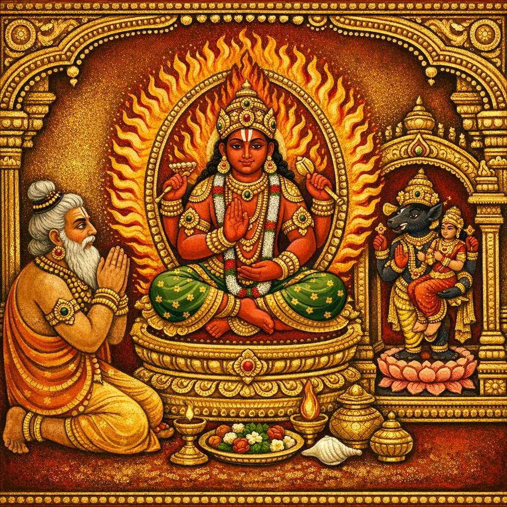 在前一章示范诸咒之后,本章转而阐释“印相”(mudrā-lakṣaṇa):礼仪手印的界定特征与运作形态,能招致 sannidhya(神圣临在)及相关仪式效应。那罗陀首先提出合掌印(Añjali)为最主要的恭敬礼拜之印,与心位相应,确立以虔敬为进入技术法则之门。随后详述具体手形——如左手握拳、拇指竖立,以及右手拇指的扣握作用——显示精确的身体编排乃 mantra-vidyā 的组成部分。经文又区分仪式 vyūha 中的通用印(sādhāraṇa)与不通用印(asādhāraṇa),并说明由小指起依次松放、展开而成的八种手印次第。文本亦提及关于 bīja 用法与求 siddhi 等目的的抄本异读,继而引入野猪印(Varāha-mudrā)及一组按序施行的 aṅganā-mudrās。最后以收摄并在右侧镜像重构手形作结,宣示正确配置可得 mudrā-siddhi——以形相之戒律成就仪轨。