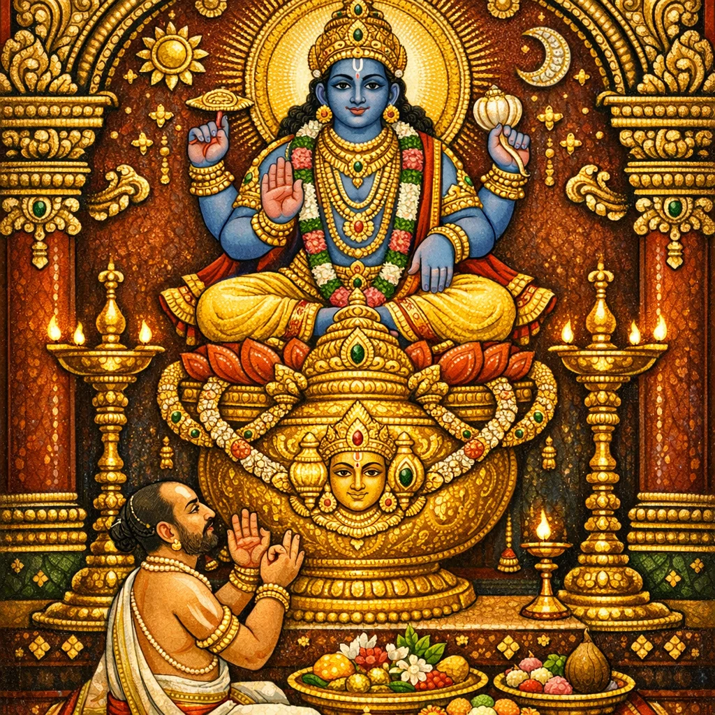 The Viṣṇu-kumbha functions as a consecration focus that, when worshipped with mantras and offerings, is said to manifest Viṣṇu’s radiance (tejas), described as sin-destroying and spiritually beautifying.