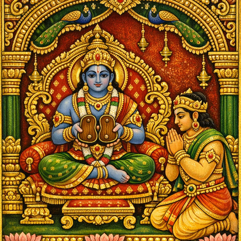 Bharata rejects illegitimate gain, seeks the rightful ruler, and administers the kingdom as a trustee (not an owner) by installing Rāma’s sandals—an archetype of delegated authority, legitimacy, and service-oriented governance.