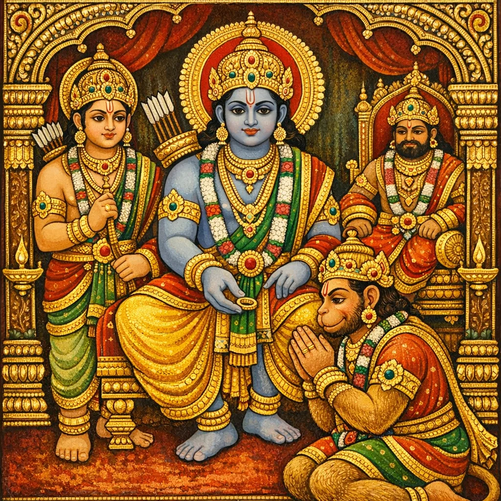 本章续述圣罗摩(Śrī Rāma)的化身戏(Avatāra-līlā),进入奇什金达(Kiṣkindhā)篇,强调依正法(dharma)结盟与严整行持。罗摩悲恸至彭帕(Pampā),在哈奴曼(Hanūmān)引导下与苏格利瓦(Sugrīva)结为友盟。为取信于人,罗摩示现超凡神力:一箭贯穿七株塔拉棕(tāla),又将敦杜毗(Dundubhi)之尸抛掷远方;继而诛伐婆林(Vālin),化解兄弟怨隙,复苏格利瓦王位。苏格利瓦因迟延而失约时,罗摩在玛利亚瓦特(Mālyavat)守持四月斋期(Cāturmāsya),罗什曼那(Lakṣmaṇa)加以告诫,苏格利瓦悔悟。随后诸婆那罗(vānara)分队奉命搜寻悉多(Sītā),并严定期限;哈奴曼受赐罗摩印戒,负责南路。南队将近困顿之际,桑帕提(Sampāti)告知悉多在楞伽(Laṅkā)阿输迦林(Aśoka grove)中,使婆那罗得以回报关键的地理与战略线索,为下一阶段救援奠基。