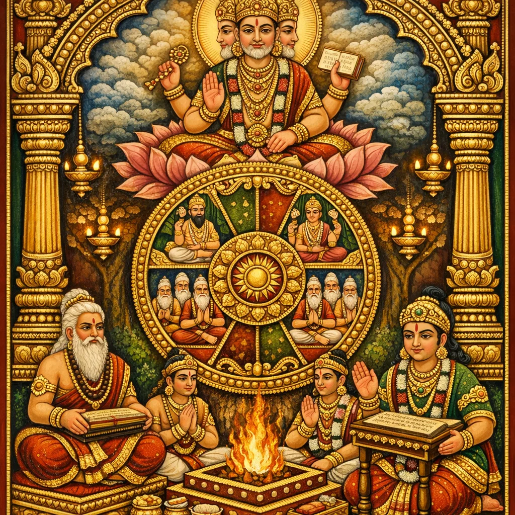 火神阿耆尼以“法”(Dharma)为中心,系统陈列诸“摩奴劫”(Manvantara):由历代摩奴(Manu)统摄的连续纪元;每一劫皆以其职司而定——摩奴、因陀罗(Indra)、诸天众(Deva-groups)、七圣仙(Saptarṣi)以及维系人间秩序的后裔。章节由早期循环(如自生摩奴Svāyambhuva等)推进至当下标识:施罗达提婆/毗婆斯瓦特摩奴(Śrāddhadeva/Vaivasvata Manu)与现今七圣仙,并展望未来的娑伐尔尼(Sāvarṇi)等诸摩奴,强调梵天(Brahmā)一日之中共有十四次此类治理。确立宇宙政序为法的结构后,阿耆尼转而论“智的治理”:在二婆罗纪(Dvāpara)末,哈利(Hari)分割原初吠陀,规定四吠陀的祭司职分,并追述其经由毗耶娑(Vyāsa)弟子——派罗(Paila)、毗舍摩波耶那(Vaiśampāyana)、阇弥尼(Jaimini)、苏曼图(Sumantu)——及后续传承与支派(śākhā)的流布。由此显明一条连续体:宇宙周期与经典谱系同为有序体系,以护持祭祀(yajña)、知识与法。