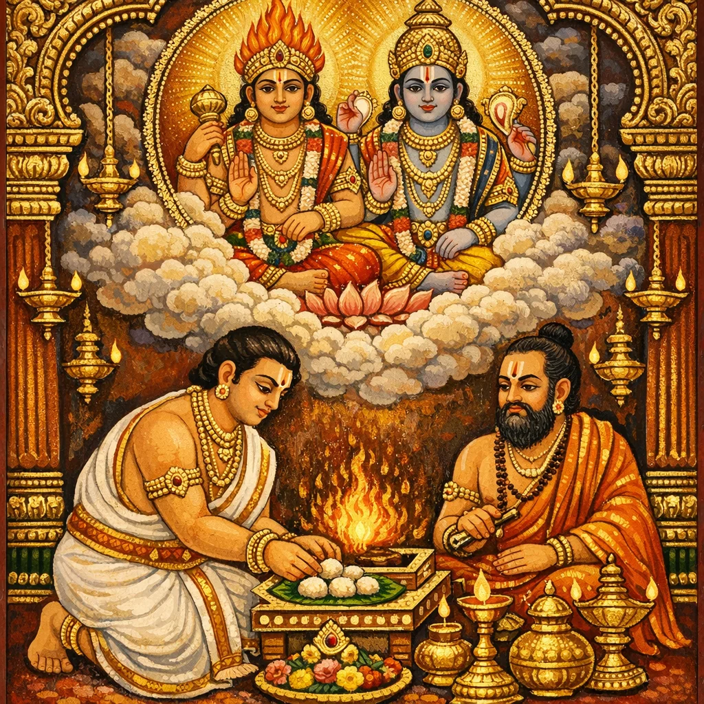 应当如法奉献供火之供物(āhuti);在一切情形下,皆应以四份为一组。又应依先前所述,分别逐一安置团食供(piṇḍa)。