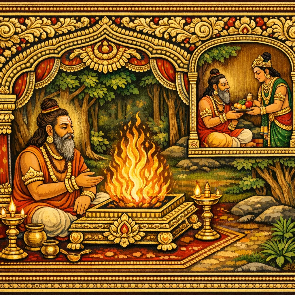 承接《法论》次第,普什迦罗阐明林居期(vānaprastha)与林中苦行者的规范生活,作为居家者(gṛhastha)责任与更圆满出离之间的纪律之桥。章首列举外在标志与日常行持——结发蓬乱、维持阿耆尼火供(Agnihotra)、卧地而眠、披鹿皮——显示虽退隐社会,吠陀祭仪仍不断绝。继而规定居住森林,节制饮食(乳、根茎、nīvāra野米、果实),拒受馈赠,每日三浴,并守梵行(brahmacarya),以净化动机、减少依赖。法(dharma)在社会层面体现为敬神礼拜与款待宾客;对游行者(yati)则指示以草药维生。待家主见子孙安立成家,方可入林依止。又将随季节之苦行系统化——夏行五火苦行,雨季露处受雨与天,冬季着湿衣严修——终以“唯向前行、不复回返”之誓,象征对依正法而离欲的不可逆承诺。