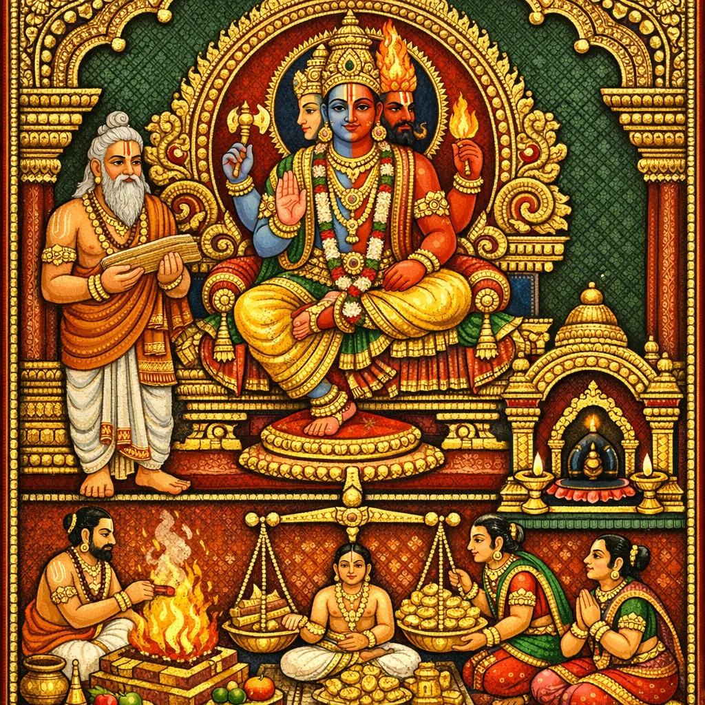 无论行于入世之道(pravṛtti),或行于出离之道(nivṛtti),皆当礼拜彼——赐予享受与解脱者。就阿耆尼形态之毗湿奴而言,其供奉在于火供(havana)、禅观(dhyāna)与仪式礼拜(arcana)。