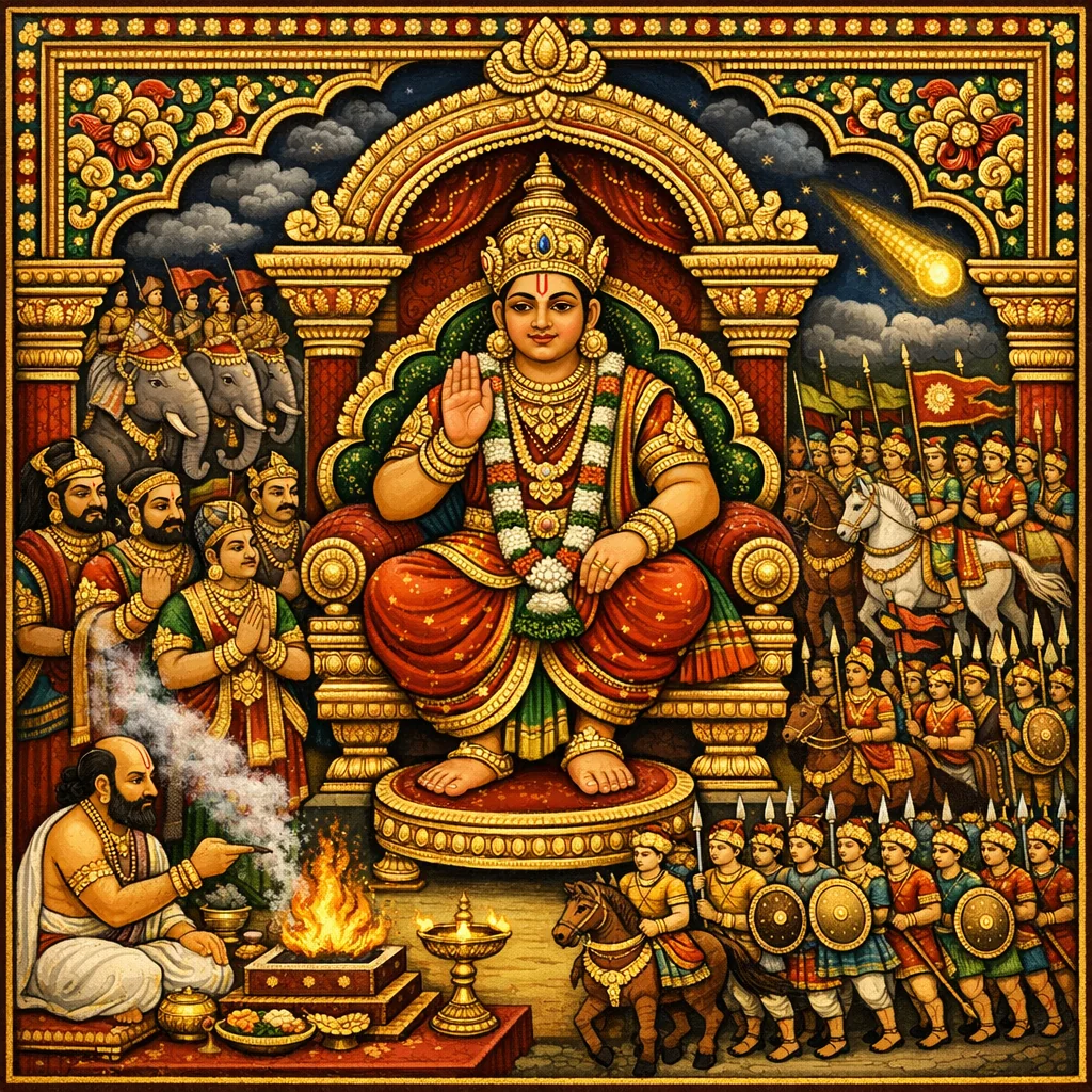 本章由前一章的刑罚制度(daṇḍapraṇayana)转入国王的下一项义务:决定何时、以何方式进行“远征”(yātrā)之军事出师。普什迦罗依王法(rāja-dharma)与具预测性的治国术提出判断标准:当遭更强之侵略者威胁,尤其是背后袭击之敌(pārṣṇigrāha)得势时,国王应当进军;但须先审度备战是否完足——兵士粮饷充足、随从支援齐备、根本之地防护稳固。经文又融入 nimitta-śāstra(征兆之学)以择定战机,指出敌方遭逢灾厄,并观天象如地震所向与彗星/计都(ketu)之污染。身体吉凶之征(sphuraṇa)、梦兆与 śakuna 之鸟兽占验,皆用以指引是否向敌堡推进并于胜后班师。末后规定按季节配兵:雨季重步兵与象军;寒季、春季或初秋则增车兵与马军,并将征兆依右/左与男女而分别判读。