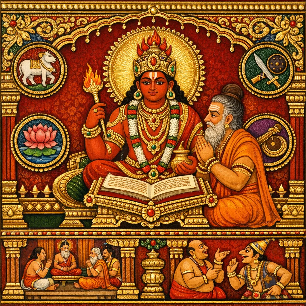 本章续讲阿兰迦罗(诗学)之学,火神阿耆尼由“味”(rasa)理论转入 rīti(文体/风格),指出风格是 vāk-vidyā(言语之学)的正式要素。rīti 分为四种地域—质地之体:Pāñcālī、Gauḍī(Gauḍadeśīyā)、Vaidarbhī、Lāṭī,并以修饰之繁密(upacāra)、句法连贯(sandarbha)与结构铺陈(vighraha)为其判别标准。继而由诗体转论戏剧之 vṛtti(表演/行动风格),说明四种以行动为本的体式:Bhāratī、Ārabhaṭī、Kauśikī、Sāttvatī,从而贯通 kāvya 理论与 nāṭya 原则。Bhāratī 被描述为以措辞为先、言语自然,系出 Bharata 传统;并略述其支分及相关戏剧形态(如 vīthī 与 prahasana),列举 vīthī-aṅga。最后界定 prahasana 为滑稽闹剧,而 Ārabhaṭī 以充满力量的场面(幻术、战斗)与迅捷的舞台动作见长,显示审美技法如何在达摩文化中服务于有纪律的表达。