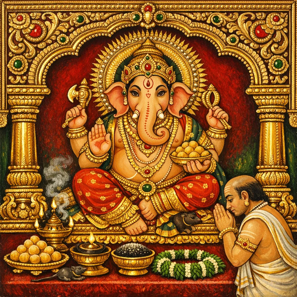 火神阿耆尼系统阐述以“第四日”(Caturthī)为核心的诸种誓戒(vrata),并明言此类修持具“双重果报”,能赐予Bhukti(世间受用与安乐)与Mukti(解脱)。本章先以简短文字提示不同传本/抄本之间的差异,继而按月份与tithi(阴历日序)分别规定仪轨。于Māgha月白半第四日,教人斋戒并礼拜,以“Guṇa”(德性、卓越之质)为仪式观想与供奉焦点。修持延续至第五日(pañcamī),以芝麻饭供献,祈求一年无障碍的安康,并引入根本咒(mūla-mantra)“gaṁ svāhā”,说明其在aṅga-nyāsa(以“gām”等心咒与肢体安置咒)中的运用。随后详列以“āgaccha ulk┓gaccha ulkā”行āvāhana(迎请)与visarjana(送神)的次第,并配以guggulu香、modaka甜团等供品,另加一段近似Gaṇeśa-gāyatrī的咒语。末后归纳专门行法:Bhādrapada月第四日的Kṛcchra苦行、Phālguna月第四日名为Avighnā的夜间斋戒,以及Caitra月第四日以damana/dūrvā草供奉Gaṇa,显示誓戒乃成就吉祥与净化身心之法门。