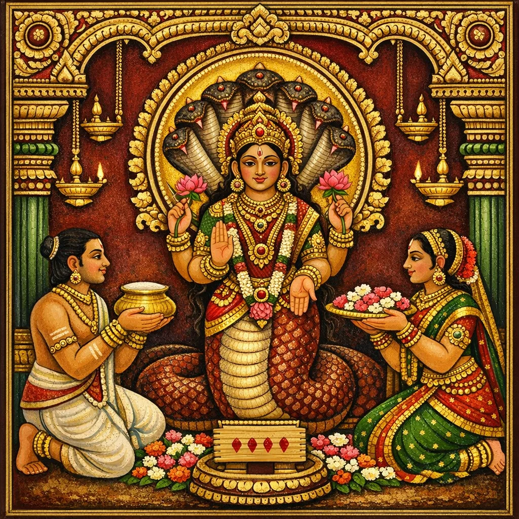 在《誓戒品》(Vrata-khaṇḍa)的次第中,火神阿耆尼宣说一套专门的“第五日誓戒”(Pañcamī-vrata),能成就现世与究竟之果:ārōgya(健康)、svarga(天界福德)与 mokṣa(解脱)。本章开端先作文本校勘提示,指出咒语/诵念层面存在异读,强调《往世书》重在正确发音与仪轨精密的实践取向。随后阿耆尼规定行持时日:于 śukla-pakṣa(白分、明半月)之中,在 Nabhas、Nabhasya、Āśvina 与 Kārttika 四月行此誓戒,以时间之法(time-dharma)安立修持。仪式要点之一,是忆念/诵持诸大龙王( nāga )之名——Vāsuki、Takṣaka、Pūjya、Kāliya、Maṇibhadra、Airāvata、Dhṛtarāṣṭra、Karkoṭaka、Dhanañjaya——其召请成为护佑与吉祥的框架。所说功德为无畏、延寿、增智、得名与致富,体现《阿耆尼往世书》的综合特色:以誓戒为灵性修炼,亦为安乐福祉之“法门技术”,归于 Agneya Vidyā 之中。