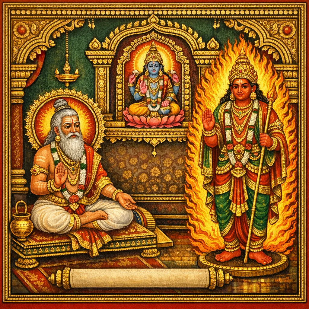 噢,最胜之二次生者,当为毗湿奴行“顶髻(śikhā)仪”,以阿格涅伊(Agneyī)、伐楼尼(Vāruṇī)与爱湿阿尼(Aiśānī)三种具甘露(amṛta)之性力,连同阿耆尼(Agni),并以“phaṭ”之喝声作结。