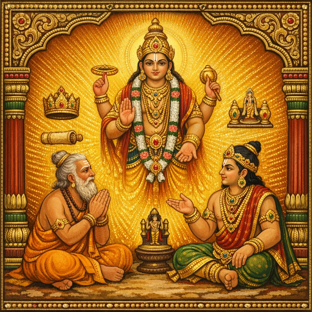一千天界之年过去后,他前去拜见尼达迦。尼达迦在毗湿瓦德瓦供献结束后用食,便对弟子说道:“你已食毕;你心中已生起 tṛpti(饱足、满足)——因此,能赐长久圆满的 tuṣṭi(安足、知足)便直接显现。”