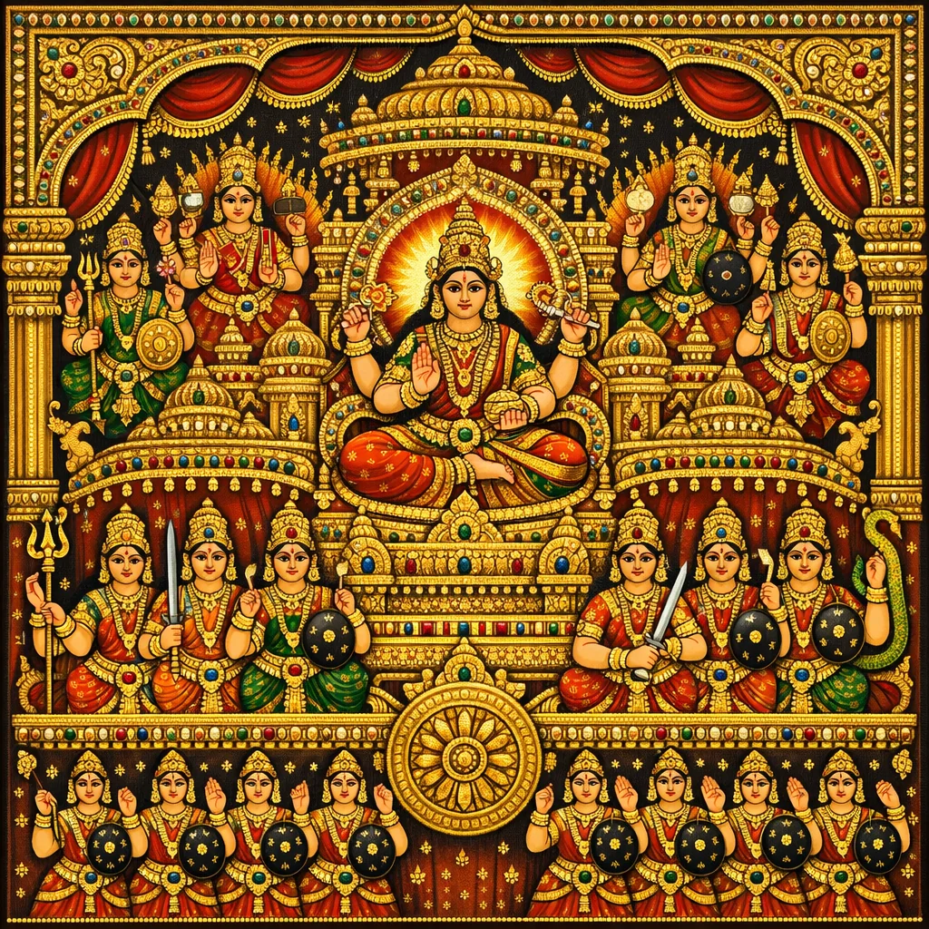 本章置于《拉利托帕迦耶那》(Lalitopākhyāna)的叙事框架中,以对话展开:阿伽斯提耶(Agastya)询问海耶格利瓦(Hayagrīva),在光辉灿烂的“轮王”(Cakrarāja)战车(至尊车,rathendra)各个“parvan”(分段/阶段)上安置着哪些显现的神祇。海耶格利瓦遂作系统列举:(1) 悉地女神(Siddhi-devī)——将瑜伽成就人格化者,如 Aṇimā、Mahimā、Laghimā、Garimā、Īśitā、Vaśitā、Prāpti、Siddhi,并及 Prākāmya、Mukti-siddhi、Sarvakāma 等,兼述其形相特征(多臂、色如朱槿/迦波花japā)与圣器武具(如 kapāla 头骨钵、triśūla 三叉戟、cintāmaṇi 如意宝珠之象征)。(2) 八大母力/八神力(Aṣṭa-śakti/Brahmādyā):Brāhmī、Māheśvarī、Kaumārī、Vaiṣṇavī、Vārāhī、Māhendrī、Cāmuṇḍā、Mahālakṣmī,安置于车之前部,并承认其观想形态与兵器多与相应主神相似。(3) 随后转入“印契女神”(Mudrā-devī),即手印之人格化,说明其位置、手印、色相与盾剑等武具,并列举其功用名:Sarvasaṃkṣobhiṇī、Sarvavidrāviṇī、Sarvākarṣaṇī、Sarvavaśaṅkarī、Sarvonmādanī、Sarvamahāṅkuśā、Sarvakhecarī、Sarvabījā、Sarvayoni、Sarvatriśaṇḍikā,皆为显现之神力(prakaṭa-śakti)。本章以分类法为纲:将拉利塔(Lalitā)的胜利行军呈现为一幅力量宇宙图——瑜伽悉地、母神之力与仪轨手印——依轮王战车所寓示的坛城/yantra几何而分布。