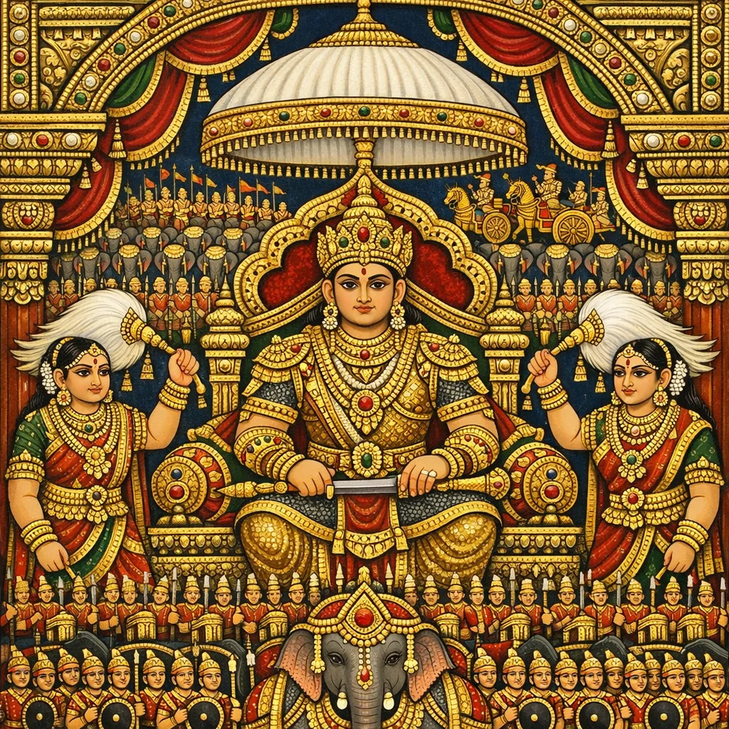 The royal insignia and massive escort symbolize concentrated asuric authority and pride; narratively, it sets up a theologically charged reversal where Devī’s order (often through Gaṇas/Gaṇanātha) subdues the inflated ego-power embodied by Bhaṇḍa’s commanders.